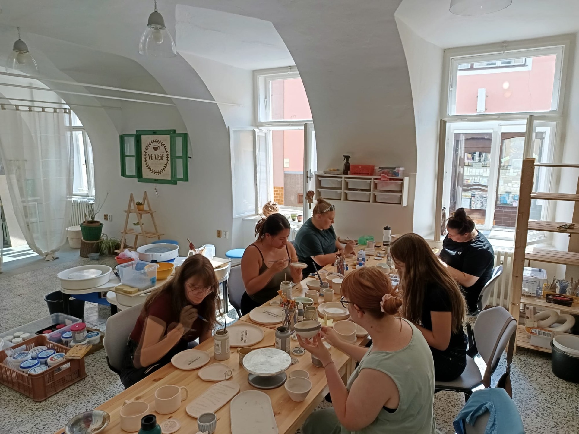 V ateliéru najdete 4 hrnčířské kruhy, místo pro modelování až pro 6 lidí a spoustu pomůcek ke tvoření. K dispozici jsou různé druhy keramických hlín, glazury od běžných po efektní i další dekorační materiály. Zkrátka malý ráj pro všechny, kdo chtějí něco vytvořit vlastníma rukama.
